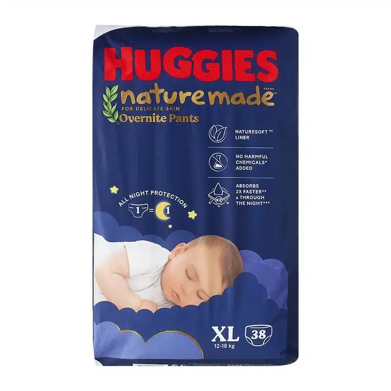 - Tã quần Huggies Nature made Overnite được cải tiến thiết kế phù hợp cho bé sử dụng ban đêm, mang lại cho bé sự khô thoáng, dễ chịu, từ đó đem đến giấc ngủ ngon suốt đêm dài.