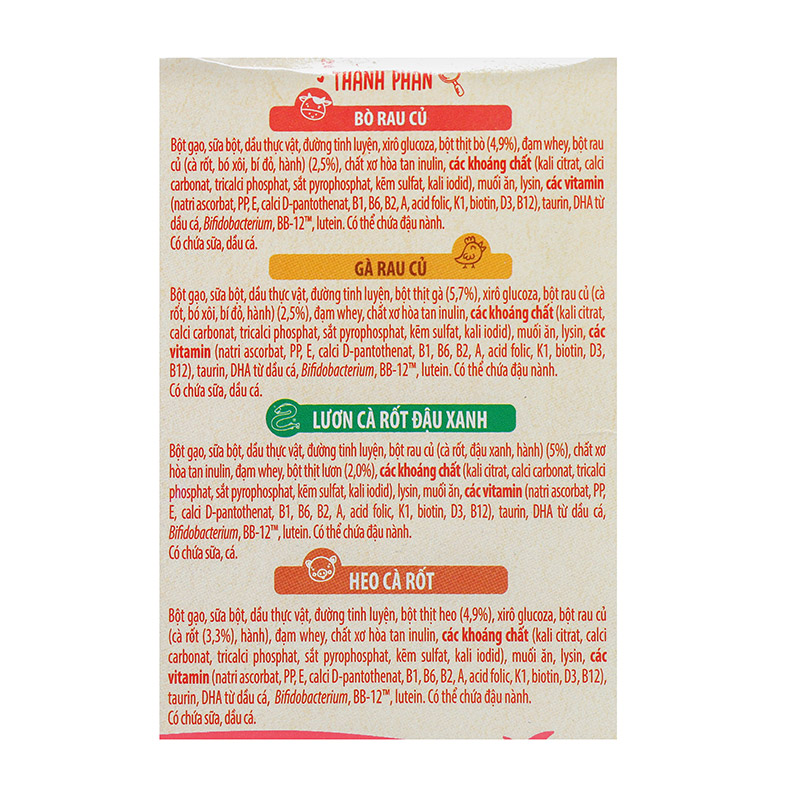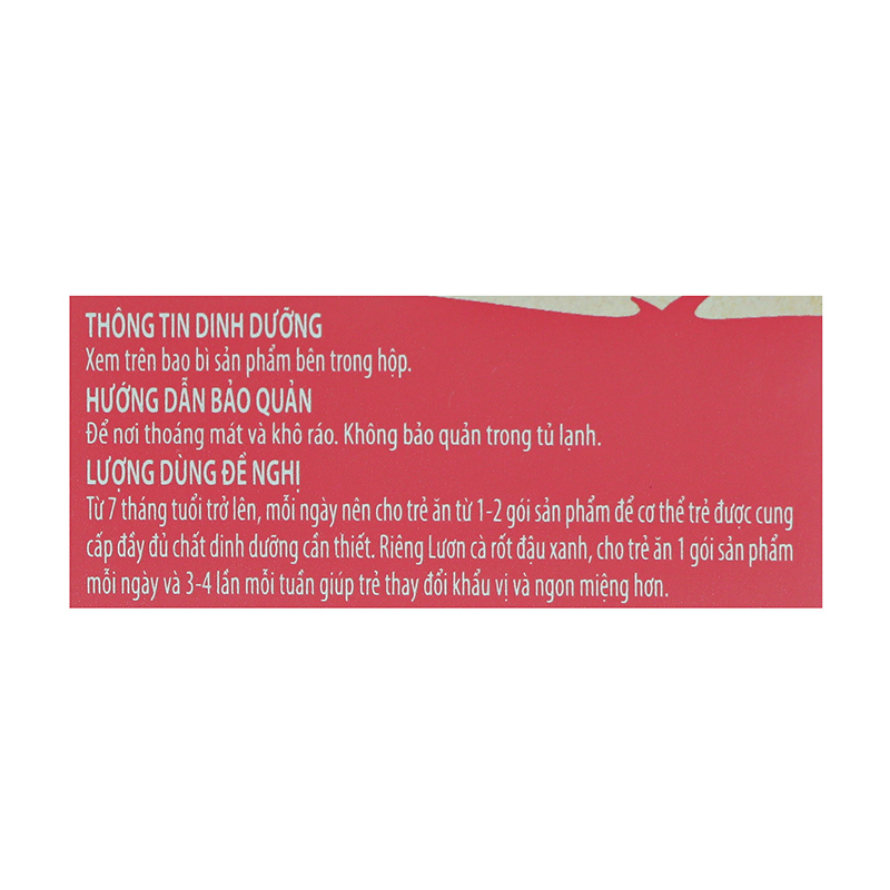 CHÚ Ý: “Sữa mẹ là thức ăn tốt nhất cho sức khỏe và sự phát triển toàn diện của trẻ nhỏ. Sản phẩm này là thức ăn bổ sung và được ăn thêm cùng với sữa mẹ dùng cho trẻ trên 6 tháng tuổi”.