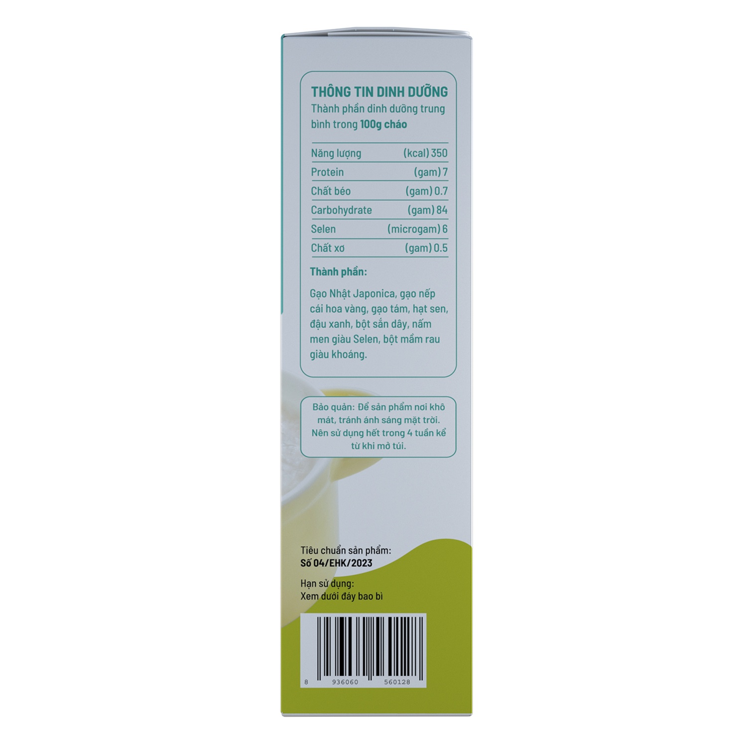 3 loại gạo đặc sản: Gạo Nhật Japonica, Gạo Tám thơm, Gạo Nếp cái hoa vàng. 3 loại ngũ cốc giàu dinh dưỡng: Hạt sen, Bột sắn dây, Đậu xanh. 2 vi chất thiết yếu cho cơ thể: Selen hữu cơ từ Nấm men và Kẽm từ Bột mầm rau.