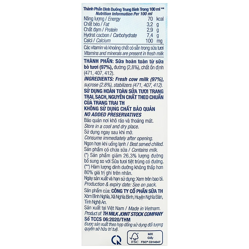 | Thành phần chính | Sữa bò tươi (97%), đường (2,8%), chất nhũ hóa và ổn định (E471, E407, E412) |
